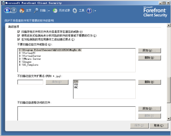 最近,发现使用 QQ 的时候经常会出现一卡一卡的现象很让人恼火,耽误使用,严重影响了操作体验。拿出测试工具检测硬盘,发现硬盘状况良好,性能指标也就那样了。做了磁盘整理,也重新做过系统总是不能有效解决这个现象。无意中回忆起之前使用 Norton 时也有这样的问题,当时根据网上搜索的解决方法是将 QQ 的聊天信息数据库给排出扫描,难道还是因为这个原因?于是打开 Forefront Client Security 切换到“工具”选项卡,进入“选项”设置,在高级选项中进行文件排出,我们只需要把 msgex.db 给排出掉即可。哈哈,问题解决了!因为 Forefront Client Security 不再频繁扫描 msgex.db 文件,所以 QQ 来信息后的相应速度变快了,不在出现卡停状态。系统的整体相应速度因为不受即时扫描的影响,所以速度也出现了大幅度的提升。之前由于 Thinkpad x60 配置高所以性能下降感觉并不明显也没有往这方面想,在单位又没时间去找原因。