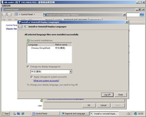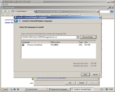 安装方法很简单,通过控制面板中的 "Regional and Language Options" 进行安装。打开 "Regional and Language Options" 后切换到 "Keyboards and Languages",点击 "Install/uninstall languages..."根据向导进行用户界面语言包的安装。简体中文的用户界面语言包大概有 400M 左右,我在虚拟机中安装还是耗费了不短的时间!等待……